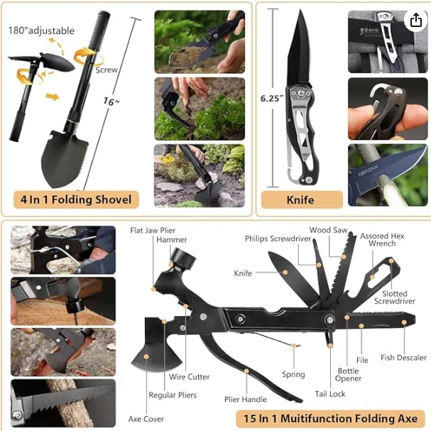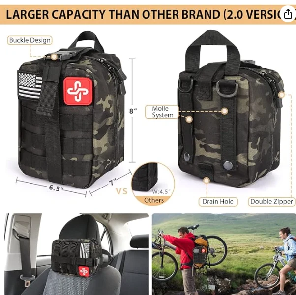 Molle Outdoor First Aid -Beutel umfasst insgesamt 250 PCS -Mehrzweck -Überlebenswerkzeuge. Es enthält die beliebtesten Überlebensausrüstung und Werkzeuge, auch ein Erste -Hilfe -Kit, das unter Notfällen ausreicht, um eine Familie oder eine Gruppe von Freunden zu behandeln.